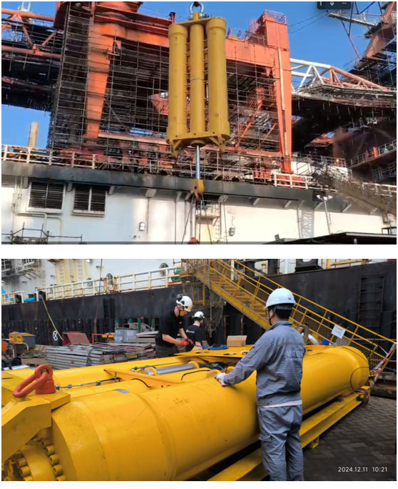 海洋石油建設(shè)位于海洋深處作業(yè),離岸距離比較遠(yuǎn),并且風(fēng)浪條件惡化作業(yè)窗口期短暫。為了提高海上作業(yè)施工的效率,上海朗信為海洋石油引進(jìn)挪威被動式波浪補(bǔ)償器,并2024年12月份完成首次陸地上的調(diào)試和交付。